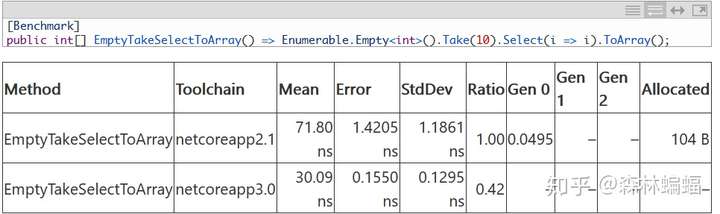Enumerable.Empty<T>()在这个PR中也被修改了,来更好地配合DNC的System.Linq中已有的优化。虽然不应该在Enumerable.Empty<T>()的结果上显式调用额外的LINQ操作,但是IEnumerable<T>的返回值可能是一个Empty<T>()的结果也很正常,然后调用者可能在其上进行别的操作,因此这个优化很有必要:
