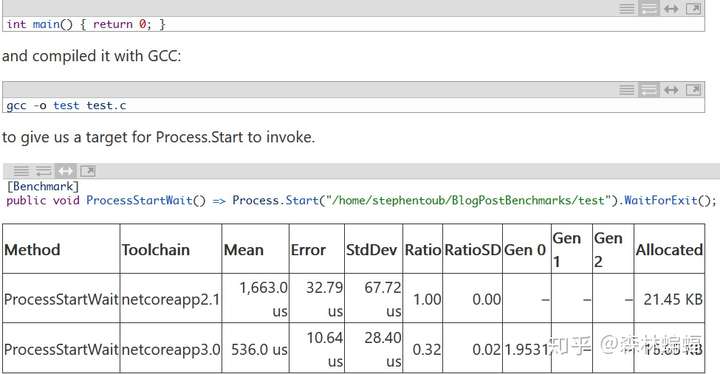 另一个例子更有影响力,joshudson的这个PR将复制一个新进程的本机代码从使用fork函数换成了vfork函数,vfork的好处在于避免了将父进程的页表复制到子进程中,假设子进程会通过几乎立刻执行的exec调用,来重写一切。fork做的是copy-on-write(奶牛,写入时复制),但是如果进程并行地调节很多状态(例如带GC运行),这么做代价就很高,还没什么必要,为了这个测试,我在test.c中写了一个没有语句的C程序:
