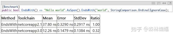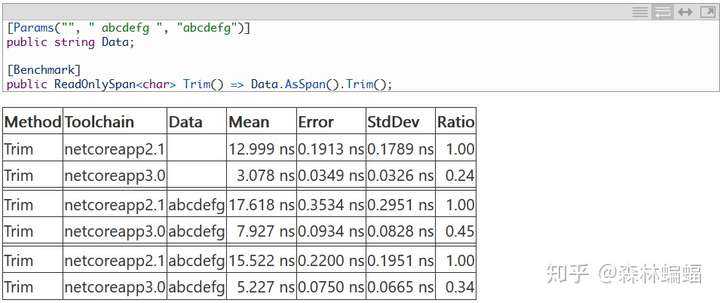 这个PR优化了ReadOnlySpan<char>.TrimStart/TrimEnd()的性能,也是个很普遍使用的方法,得到了可喜的结果(很难看到结果中的空白部分,但是表中的结果是按照Params属性里的参数顺序排列的)