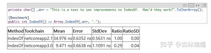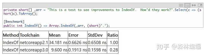 很多用在Span上的向量化优化也一样地用在了数组上。benaadams(怎么又是这个人)的这个PR针对字节和char都优化了Array.LastIndexOf和IndexOf方法,使用了和Span类内部一样的内部辅助方法,也得到了相似的优化结果: