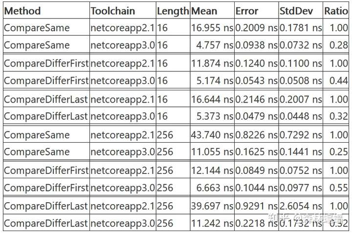 当然,有很多其他(也更受人欢迎)的方式去操作Span的数据,而不是用fixed关键字。比如,让人有点吃惊的是,直到Span<T>到来之前,.NET都没有一个内建的memcmp(memory compare,C/C++专属)等效品,但现在Span<T>的SequenceEqual 和SequenceCompareTo方法已经成为了.NET比较内存区域数据的必要手段。在DNC2.1中,这两个方法运用了System.Numerics.Vector优化以实现向量化,但是SequenceEqual的情况使得它更容易被人利用。在这个PR中,benaadams针对AVX2和SSE2(两个最常见的SIMD指令集)更新了SequenceCompareTo以利用DNC3中新的intrinsic API,导致了比较无论大小的Span的性能的显著提升。(如果想查阅更多关于DNC3中intrinsic的信息,可以看这里和那里)。
