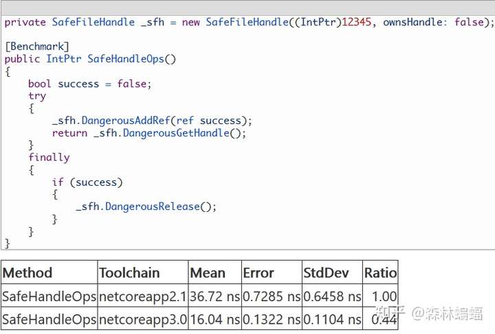 一个值得注意的类是SafeHandle,另一个把代码从本机代码迁移到托管代码获得性能提升的例子,SafeHandle是管理非托管资源生命周期的推荐方式,不管是Windows上的句柄,还是unix上的文件描述符,它在coreclr和corefx的所有托管库里的内部使用方式也是如此。推荐使用它的一个原因是它会使用合适的同步机制确保这些非托管资源不会在使用时就被托管代码关闭,那就意味着互操作层需要跟踪SafeHandle搞出来的每一个P/Invoke,在P/Invoke之前调用DangerousAddRef,P/Invoke之后调用DangerousRelease,还需要DangerousGetHandle来提取实际的指针值,将其传递给本机函数。在.NET的以前版本中,这些实现的核心部分是在运行时,意味着托管代码需要在运行时对每个这样的操作都对本机代码建立InternalCall。在DNC3的这个PR中,上述操作都被移动到托管代码,移除了过渡操作带来的开销。