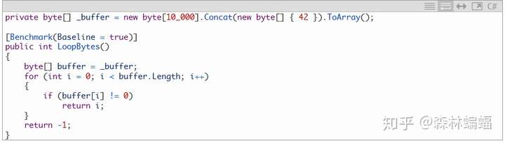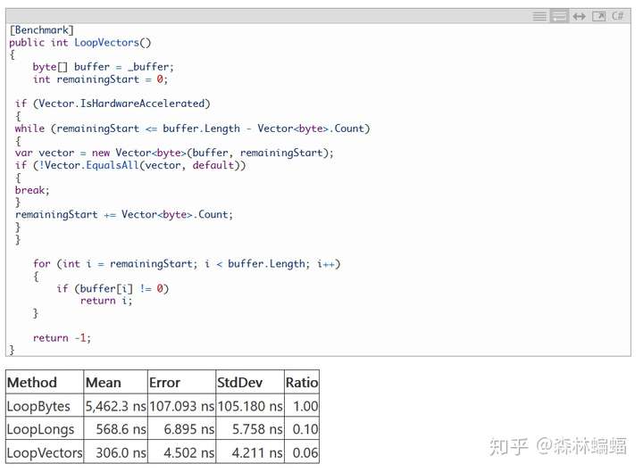 在后台,“向量化”是单核心单指令并行执行多个操作的方法,一些优化过的编译器能自动向量化(译者注:例如使用LLVM做后端的Mono AOT,这一点目前的CoreCLR都没做到),借此编译器会分析循环来判断是否可以利用指令来生成等效的代码让它跑得更快。.NET的JIT编译器当前还不会自动向量化,但手动向量化循环是可能的,相应选项在DNC3中性能大为提高,举个例子向量化会长啥样,想象一下你想搜索一个byte数组的第一个非0 byte值,返回其位置,简单的方法是迭代所有bytes的位置: