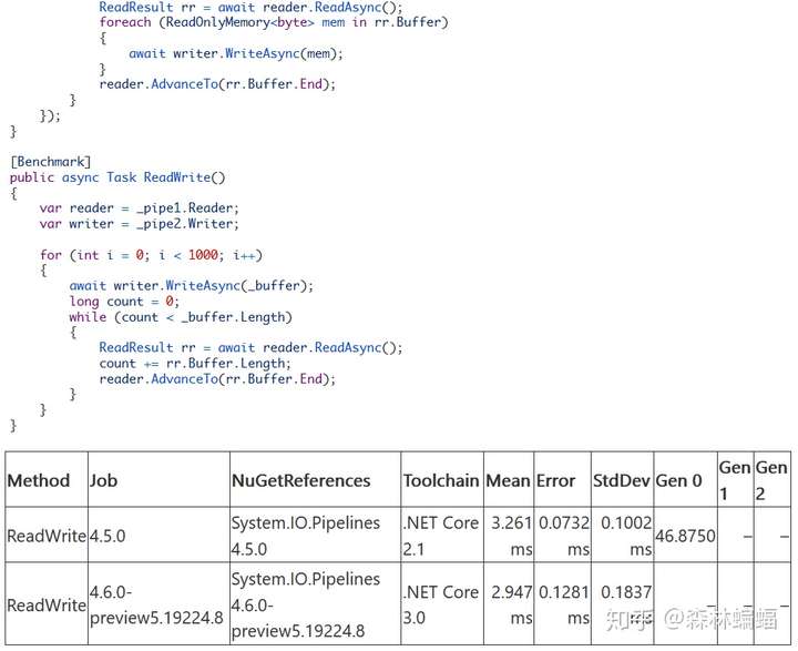 System.IO.Pipelines是另一个在DNC3中受到很多关注的类库。Pipelines在DNC2.1中就引入了,作为I/O管线的一部分提供了缓冲管理,被http://ASP.NET Core大量应用。不少PR用来提高它的性能,例如这玩意将普遍情况特殊处理,默认情况下,MemoryPool<byte>.Shared作为默认的Pool给一个Pipe使用。Pipe会直接访问底层的ArrayPool<byte>.Shared,绕过Memory<byte>.Shared,移除了一个间接层,还有MemoryPool<byte>.Rent返回的IMemoryOwner<byte>对象开销(注意这个测试,因为System.IO.Pipelines是Nuget的一部分,而不是在公共框架中,我添加了一个配置,指定了每次运行中使用哪个包版本):