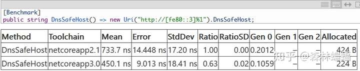另一个使用新API去改进已有功能的例子是String.Concat。DNC3有几个新的String.Concat重载,一个接收ReadOnlySpan<char>代替string,这样就很容易避免在连接其他字串的片段时带来的子串分配和复制:我们使用了String.AsSpan和Slice来替代String.Concat和String.Substring。实际上,给这些新重载提供实现,暴露和添加测试的这个PR和那个PR也给DNC添加了几十个调用点(call sites)。这有个例子,优化了Uri.DnsSafe的访问: