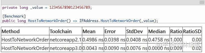 IPAddress.HostToNetworkOrder/NetworkToHostOrder间接从刚才说过的intrinsics推送中受益,在DNC2.1中,BinaryPrimitives.ReverseEndianness作为一个优化过的实现添加进来,IPAddress的方法被重写成ReverseEndianness的简单包装,在DNC3中,这个PR将ReverseEndianness换成了JIT intrinsic实现,因为JIT能够发出一个很有效率的BSWAP指令,使得IPAddress的吞吐量有所提高。