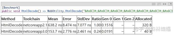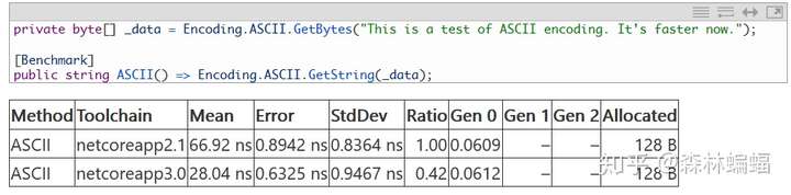 最后,一个非常接近的领域是编码。关于Encoding,一大波优化已经在DNC3中实现,不管是在通用还是特定的编码中。例如这个PR允许Encoding.Unicode.GetString在许多地方应用一个已有的极端条件优化,又或者是这个PR从多个编码实现中移除了一堆无用的虚拟间接寻址(其实就是移除了一些参数并加上一些sealed),还有这个PR,通过利用早些时候提到的“共同元数据-二进制大对象span“支持,来优化Encoding.Preamable;以及这个PR和那个PR大改并流水线化了UF8Encoding和AsciiEncoding的实现。