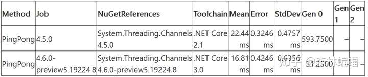 在DNC2.1中,运行时对async/await的支持大修过,彻底地减少了涉及到异步方法的分配,以前当一个异步方法第一次等待一个尚未完成的可等待操作时,基于结构体的状态机将会被装箱(就是运行时装箱)放到堆上。但是在DNC2.1中,我们使用了一个泛型对象,结构体作为这个对象的字段而存在。这样有诸多好处,其中之一是允许在这个对象上实现额外的接口,例如IThreadPoolWorkItem。这个PR很好的做到了这一点,并且使得另一个大范围应用场景进一步减少了分配,尤其是用于TaskCompletionSource<T>的TaskCreationOptions.RunContinuationsAsynchronously。可以在下面的测试中看到效果: