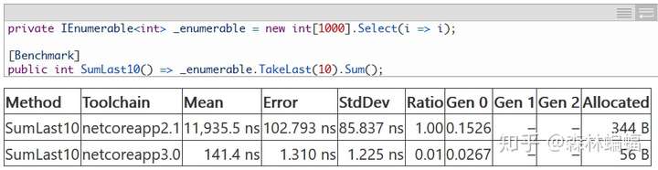 向System.Linq添加新操作的事情已经很稀少了,因为任何人都可以添加扩展方法,简单地构建和发布他们认为有用的扩展方法库(真的有这么几个历史悠久的库存在),即使这样,DNC2仍然添加了一个TakeLast方法。在DNC3中,romasz的这个PR更新了TakeLast方法,使之和内部的IPartition<T>集成,允许几个操作互相配合,有助于优化(有些情况下效果很大)这些操作的不同用途。