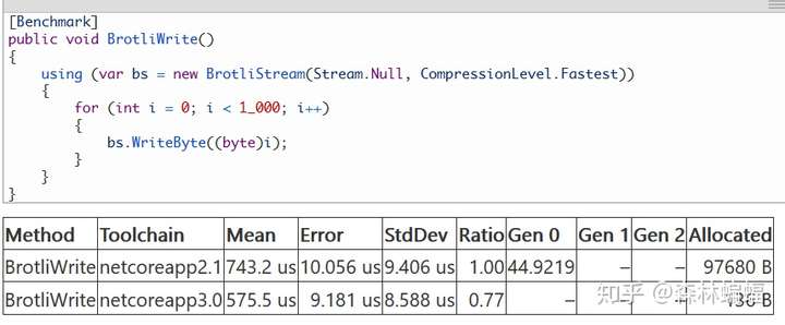 BrotliStream也作出了相应的改进(在DNC3中也被HttpClient用来自动解压Brotli编码的内容),以前每个新的BrotliStream都会分配一个很大的缓存,但是在这个PR中,缓冲被池化了,就像在DeflateStream中做的一样(另外,这个PR重写了BrotliStream的ReadByte和WriteByte以避免父类实现的分配)。