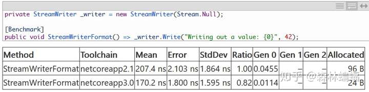 把视线从压缩上移开,应用于多场合下的格式化可比只格式化基元类型更值得介绍,例如TextWriter有很多编写格式化字串的方法,比如public override void Write(string format, object arg0, arg1),这个PR针对StreamWriter优化了这个方法,通过提供特定的重写使其更有效率,减少分配: