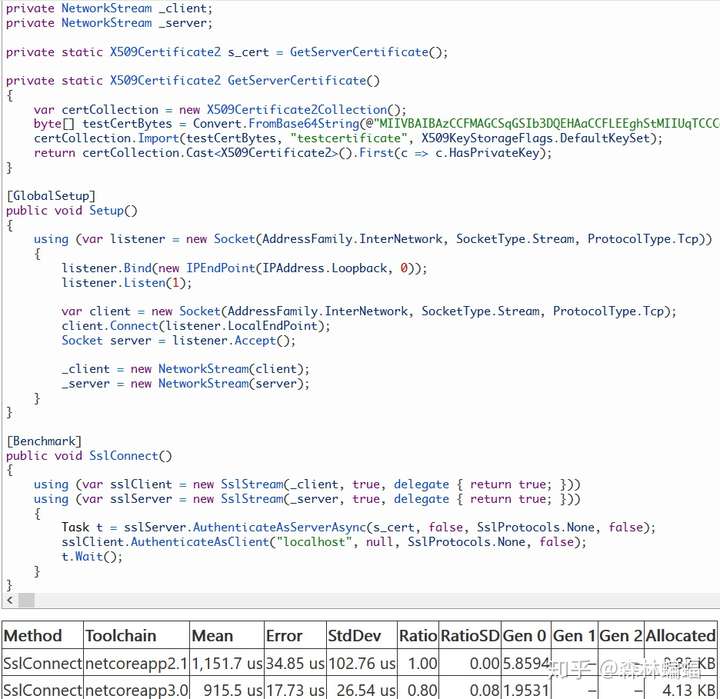 现在看看SslStream。以前的版本看上去把SslStream上的读写优化到头了,但是在DNC3中的这两个PR(还有一个给Unix的)让连接的初始化更有效率,特别是在分配方面。
