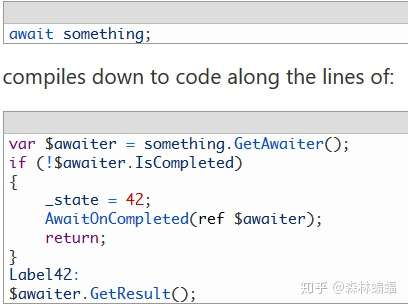 当我们执行到IsCompleted返回false的时候,将调用AwaitedOnComplated方法然后返回。如果等待操作在调用AwaitOnCompleted时完成,因为我们会在栈中进一步操作我们(又)不想同步调用重入状态机的延续,所以如果这种事情反复发生,就会发生“潜栈(stack dive)现象”,然后爆栈。相反的是,我们强制排列这个延续。这种情况并不普遍,但是会比你期望的更加频繁,这只需要一个快速异步完成的操作(多种网络操作经常属于这一类)。因为这个PR,运行时现在会利用实现了IThreadPoolWorkItem的异步状态机避免这种情况下的分配。