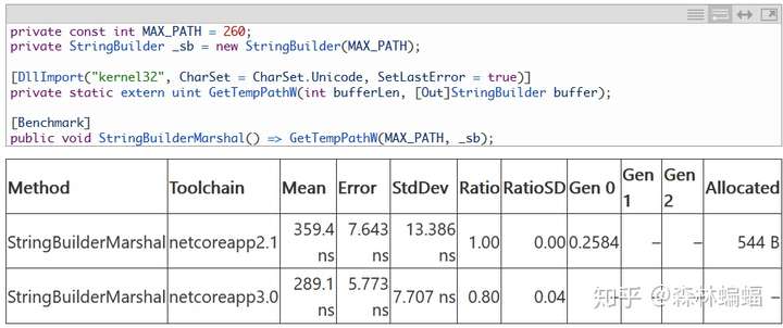 marshal的优化也有几个例子。我在这个帖子里说过几种StringBuilder用于marshal和互操作的情况,郑重声明,我个人不喜欢在互操作中用StringBuilder,因为它增加了消耗和复杂度,却没有多少增益,因此在这个PR和那个PR中,我移除了coreclr和corefx的marshal中几乎所有的StringBuilder,但是还有很多代码建立在StringBuilder的基础上,应该尽可能地快。这个PR避免了很多发生在StringBuilder的marshal操作时不必要的工作和分配,带来如下优化: