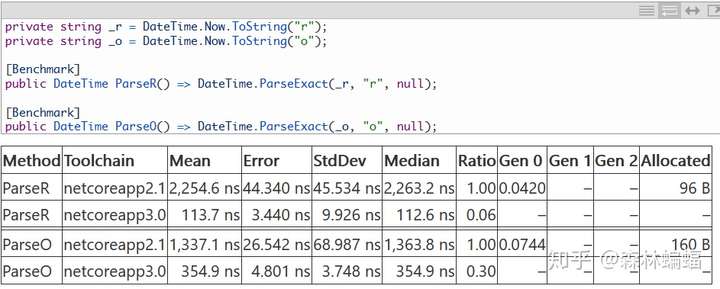 在DNC2.1中,DateTime.TryFormat和ToString方法已经针对通常使用的“o”或“r”格式优化过,在DNC3中,等价的解析也得到了类似处理。这个PR大大提高了DateTime和DateTimeOffSet的往返“o”格式解析性能,而这个PR为RFC1123格式做了一样的事,对任何DateTime的沉重序列化格式,这些改进都能弄个大新闻: