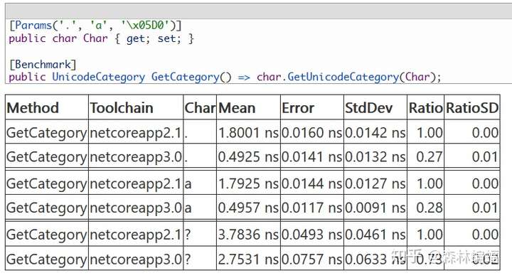 刚才的情况是String实现的功能示例,但是还有很多附加的string相关功能也被优化了,例如Char的不少操作性能都得到提升,例如这个PR和那个PR改进的Char.GetUnicodeCategory: