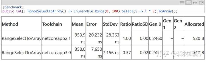 就在最近,这个PR优化了Enumerable.Range(...).Select(…)的常见模板,关于Range生成的对象针对性地优化了Select,还允许Select操作的流跳过遍历IEnumerable<T>,直接循环想要的数值范围。