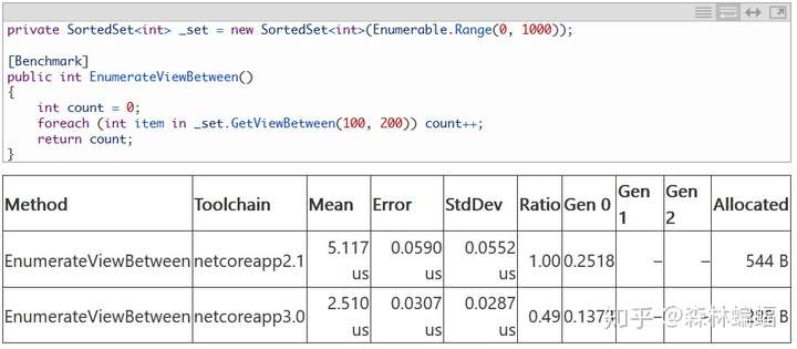 另一个例子是SortedSet<T>。acerbusace的这个PR更改了GetViewBetween修改整个集合和子集的计数管理方式,得到了漂亮的性能加速。