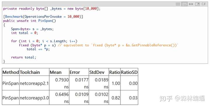 ReadOnlySpan<T>准确地做到了这一点,但是即使ReadOnlySpan<T>.GetPinnableReference已经被内联,一个内部调用的Unsafe.AsRef会阻止内联,这个PR修复了这个问题,允许整个操作被内联。上述代码进而在这个PR中被魔改,来清除热点代码的判断分支,两者加在一起导致Span的固定有了可观的加速: