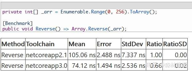 这部分不仅仅和新的API有关,在C#7.2和7.3中介绍的很多语法,包括C#8本身都受到了DNC自身需求的影响,并用于优化那些我们以前难以优化的地方(而不是沦落到去使用我们尽可能不用的非托管代码)。例如,这个PR通过利用C# 7.2的ref locals和7.3的ref local reassignment特性加速了Array.Reserve方法,使用新特性可以让代码更好地让JIT为内部循环生成代码,然后就是一个肉眼可见的加速: