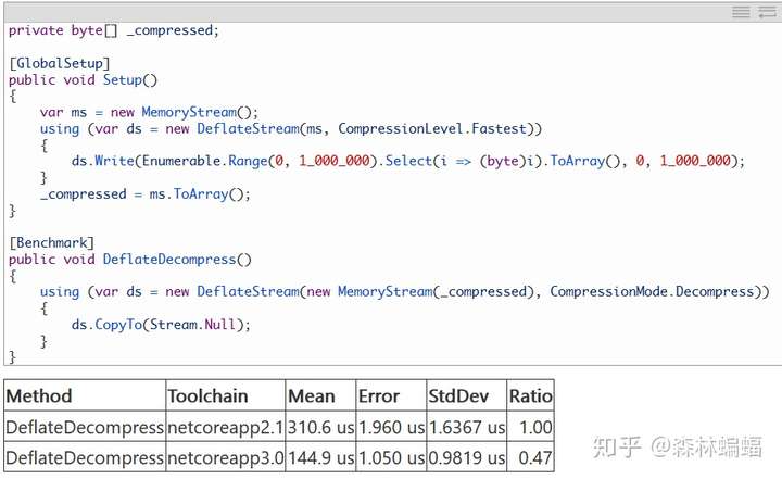也有利用了DNC上述优化的压缩相关案例,比如同步方法Stream.CopyTo以前不是虚方法,但是重写了异步的CopyToAsync方法并针对混合流类型(concrete stream types)优化后,CopyTo被设定为虚方法,来靠重写得到相似的优化。这个PR在DeflateStream上覆写了CopyTo,本质上减少了和zlib的互操作消耗。