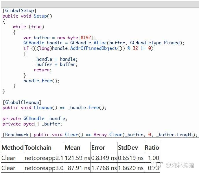 数组还有个例子,Clear方法在这个PR里也被优化了,处理了让该方法依赖的隐式memset操作变慢了2倍的对齐问题。这个改变会一个个地手动清理最多几个字节,这样我们就可以把指针交给memset去对齐,如果你“足够幸运”,数组刚好对齐,性能就不错,如果没有对齐,就会对性能有不一般的影响,这个测试模拟了不好的情况:
