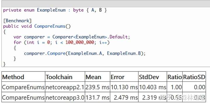 比较器在DNC3中也有漂亮的性能提升,如这个PR重写了运行时中枚举类型的比较器实现方式,借用了CoreRT中使用的方法。性能优化经常是添加代码;而这是偶然发生的,优化代码不仅更快,还更简单更小的情况。