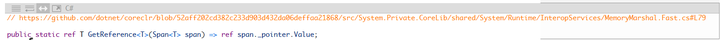 如果你的代码有构造器,确保你的Span不会是空值,你可以选择使用MemoryMarshal.GetReference,性能相同,但没有长度检查: