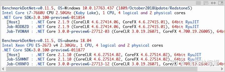 1.任何涉及到微测试的结果讨论都有一个前提,测量结果在不同的机器上是不同的,我已经尽可能地挑选一些稳定的例子来分享(“稳定”指在多台机器上以多个配置运行,以确认这一测试有效)。但是如果你测出来的数据和我展示的不同,也别太吃惊,我们仍然可以证明这些性能提高的重要性,所有的测试结果来自尚未发布的DNC 3pre6,这里是我的Windows和Linux配置项,作为使用http://Benchmark.NET的一个概述: