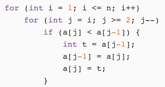 假设比较两个元素的时间为 O(1)O(1), 则揷入排序可以以 O(n2)O(n2) 的时间复杂度完成长度为 nn 的数组的排序。 不妨假设这 nn 个数字分别存储在 a1,a2,…,ana1,a2,…,an 之中, 则如下伪代码给出了揷入排序算法的一种最简单的 实现方式: