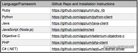 Appium的API包含在Appium Client中,下表给出不同语言平台对应的Client下载地址: