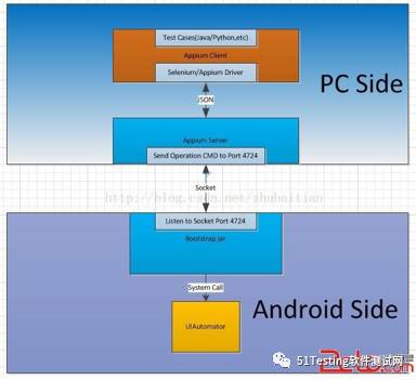 Appium 是一个开源、跨平台的自动化测试工具,用于测试原生和轻量移动应用,支持iOS, Android 和 FirefoxOS 平台。Appium 驱动苹果的 UIAutomation 库和 Android 的 UiAutomator 框架,使用 Selenium 的 WebDriver JSON 协议。下图是Appium在Android端的原理架构图: