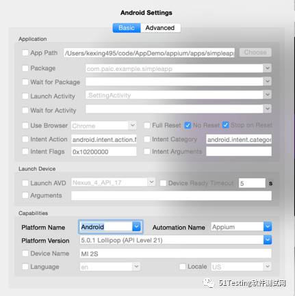 7、启动appium server(命令行或者图形界面启动),注意,启动时Android Settings中请勾选No Reset选项,可防止每次执行case时,都重新安装app,如下所示。