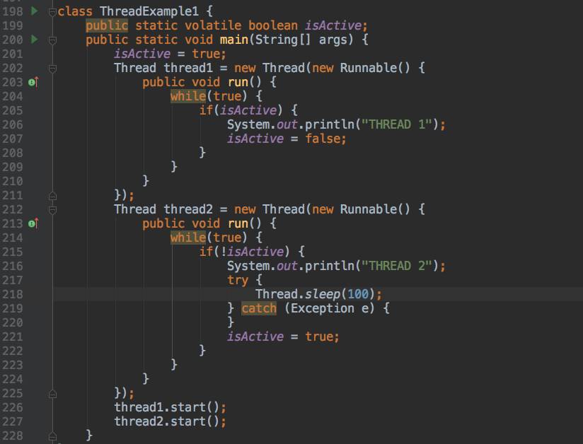 olatile变量是一种状态标志,所以运行上面的代码会打印线程数,并在它们之间交替。这是因为该标志被存储在主存储器中。如果我们去掉volatile关键字,该线程将只交替一次,因为只使用一个本地参考,两个线程基本上彼此隐身