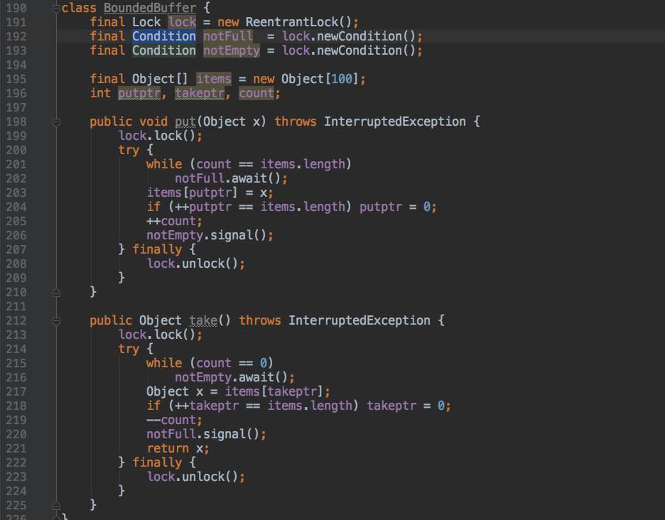 举个例子:假定有一个绑定的缓冲区,它支持 put 和 take 方法。如果试图在空的缓冲区上执行 take 操作,则在某一个项变得可用之前,线程将一直阻塞;如果试图在满的缓冲区上执行 put 操作,则在有空间变得可用之前,线程将一直阻塞。我们喜欢在单独的等待 set 中保存 put 线程和 take 线程,这样就可以在缓冲区中的项或空间变得可用时利用最佳规划,一次只通知一个线程。可以使用两个 Condition 实例来做到这一点。