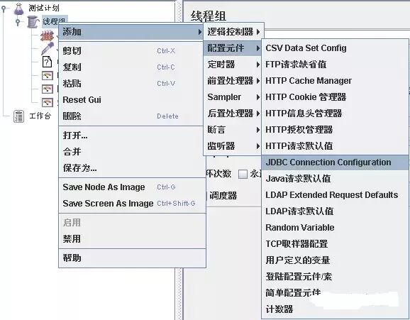 4.右键点击“线程组”,在下面添加一个“JDBC request”