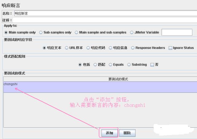 右键点击线程组---->添加--->断言---->响应断言。