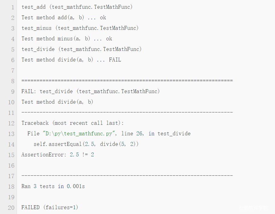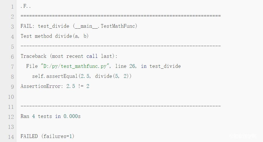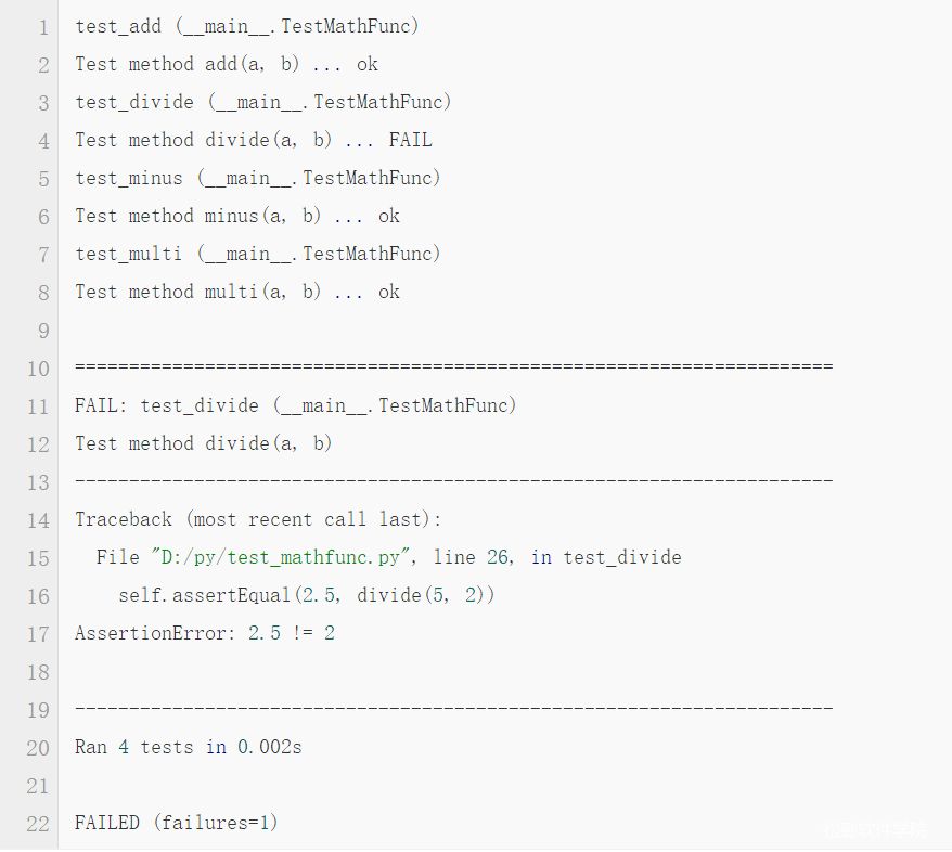 1、在第一行给出了每一个用例执行的结果的标识,成功是 .,失败是 F,出错是 E,跳过是 S。从上面也可以看出,测试的执行跟方法的顺序没有关系,test_divide写在了第4个,但是却是第2个执行的。