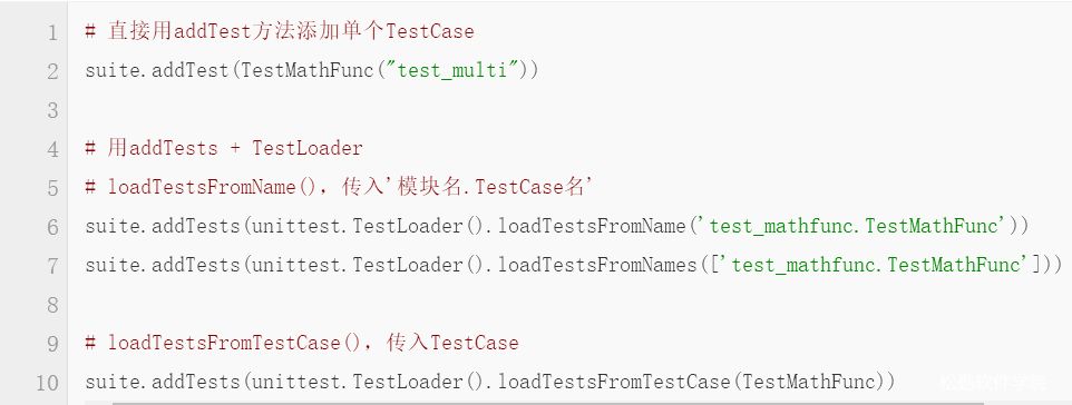 上面用了TestSuite的 addTests() 方法,并直接传入了TestCase列表,我们还可以: