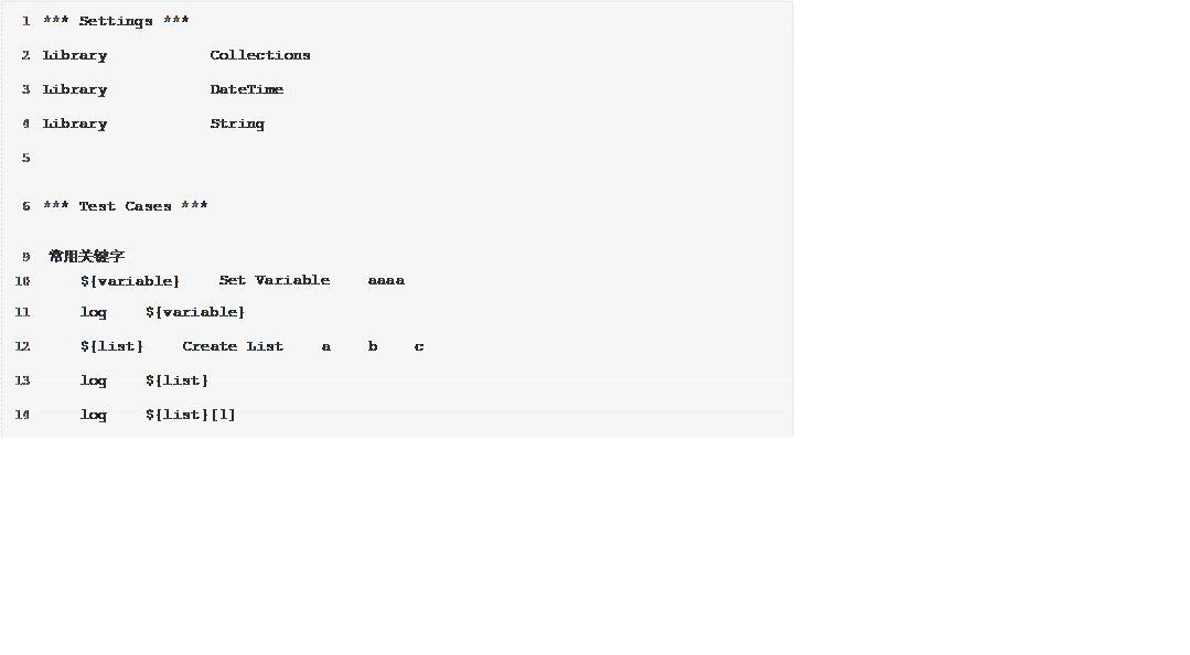 - Builtin: 使 ⽤ 前 ⽆ 需 导 ⼊ log,set variable,create list,create dictionary, Should Be Equal As - -Strings