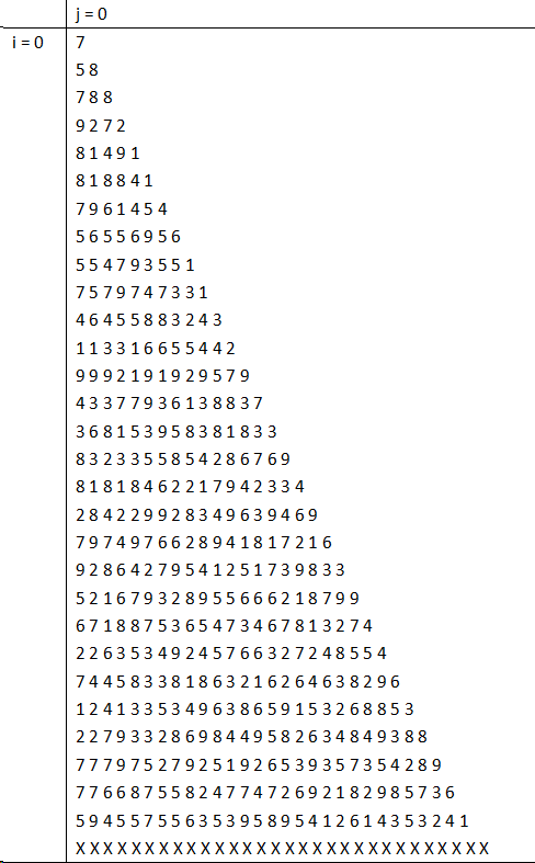 1 import java.util.Arrays; 2 import java.util.Scanner; 3 4 public class PressureCalculation { 5 6 public static void main(String[] args) { 7 8 double[][] arr = new double[30][30]; 9 Scanner input = new Scanner(System.in); 10 for (int i = 0; i < arr.length - 1; i++) {// 最后一行自动补0 11 for (int j = 0; j <= i; j++) { 12 arr[i][j] = input.nextInt(); 13 } 14 } 15 long sum = 0; 16 for (int i = 0; i < 30; i++) {// 控制行 17 for (int j = 0; j <= i; j++) {//控制列 18 if (i == 0 && j == 0) //第0行是边界 19 continue; 20 if (j == 0) { 21 arr[i][j] += arr[i - 1][j] * 0.5; 22 } else if (i == j) { 23 arr[i][j] += arr[i - 1][j - 1] * 0.5; 24 } else { 25 arr[i][j] = arr[i][j] + arr[i - 1][j] * 0.5 + arr[i - 1][j - 1] * 0.5; 26 } 27 } 28 } 29 Arrays.sort(arr[29]);//对计算出的第30行排序 30 System.out.println(2086458231 / arr[29][0] * arr[29][29]); 31 } 32 }