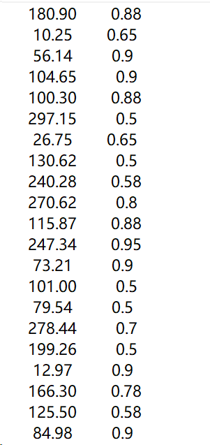 1 import java.util.Scanner; 2 3 public class ShoppingList { 4 5 public static void main(String[] args) { 6 7 Scanner input = new Scanner(System.in); 8 double[][] arr = new double[50][2];//把数据复制到excel,就知道有多少个物品 9 for (int i = 0; i < arr.length; i++) { 10 for (int j = 0; j < 2; j++) { 11 arr[i][j] = input.nextDouble(); 12 } 13 } 14 double sum = 0; 15 for (int i = 0; i < arr.length; i++) { 16 sum += arr[i][0] * arr[i][1]; 17 } 18 System.out.println(sum); 19 } 20 }