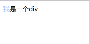 <!DOCTYPE html> <html lang="en"> <head> <meta charset="UTF-8"> <title>Title</title> <style> div:first-letter{ font-size: large; color: #9fcdff; } </style> </head> <body> <div>我是一个div</div> </body> </html>