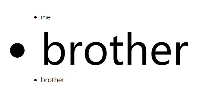 <!DOCTYPE html> <html lang="en"> <head> <meta charset="UTF-8"> <title>Title</title> <style> body { margin: 100px; } li:first-of-type { font-size: 100px; } </style> </head> <body> <ul> <li>me</li> <li>brother</li> </ul> </body> </html>