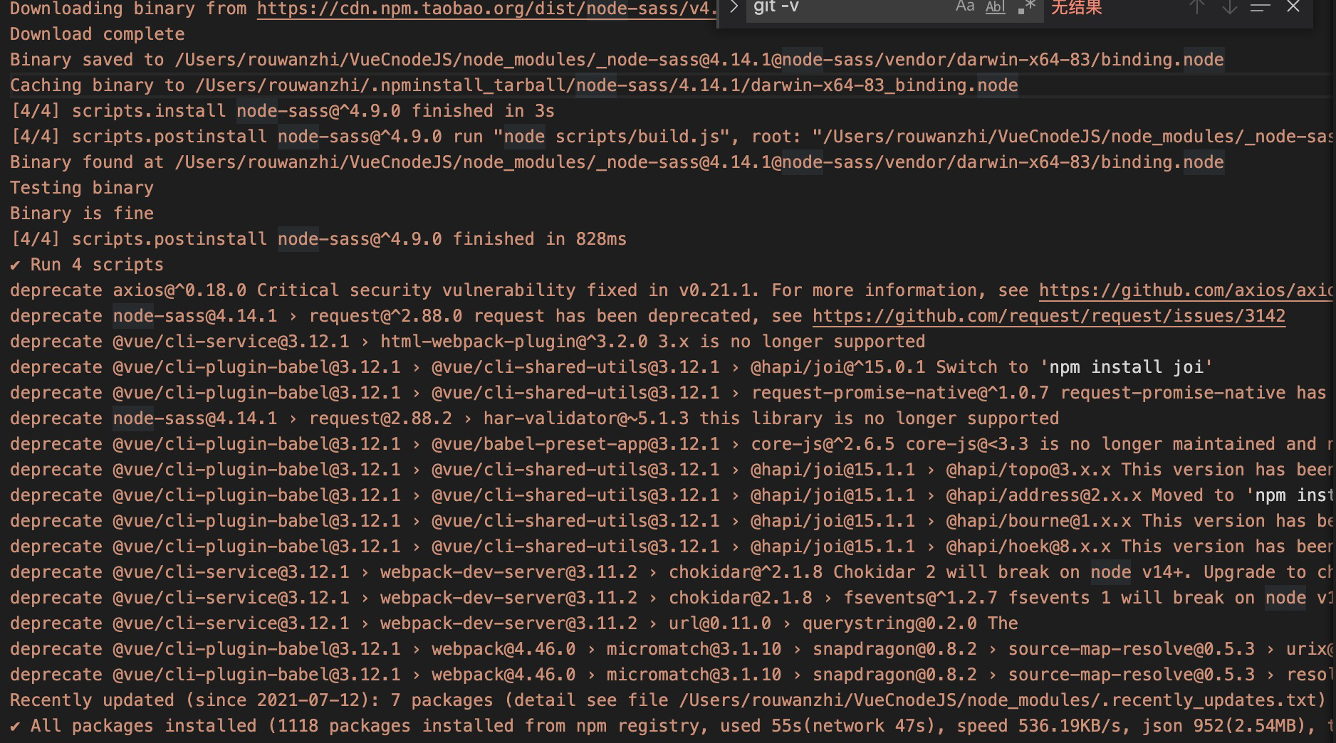 正克隆到 'VueCnodeJS'... remote: Enumerating objects: 583, done. remote: Counting objects: 100% (11/11), done. remote: Compressing objects: 100% (11/11), done. remote: Total 583 (delta 0), reused 3 (delta 0), pack-reused 572 接收对象中: 100% (583/583), 1.21 MiB | 986.00 KiB/s, 完成. 处理 delta 中: 100% (278/278), 完成. rouwanzhi@rouwanzhideMBP ~ % cd VueCnodeJS rouwanzhi@rouwanzhideMBP VueCnodeJS % npm install npm WARN deprecated fsevents@1.2.13: fsevents 1 will break on node v14+ and could be using insecure binaries. Upgrade to fsevents 2. npm WARN deprecated chokidar@2.1.8: Chokidar 2 will break on node v14+. Upgrade to chokidar 3 with 15x less dependencies. npm ERR! code 1 npm ERR! path /Users/rouwanzhi/VueCnodeJS/node_modules/node-sass npm ERR! command failed npm ERR! command sh -c node scripts/build.js npm ERR! Building: /usr/local/bin/node /Users/rouwanzhi/VueCnodeJS/node_modules/node-gyp/bin/node-gyp.js rebuild --verbose --libsass_ext= --libsass_cflags= --libsass_ldflags= --libsass_library= npm ERR! gyp info it worked if it ends with ok npm ERR! gyp verb cli [ npm ERR! gyp verb cli '/usr/local/bin/node', npm ERR! gyp verb cli '/Users/rouwanzhi/VueCnodeJS/node_modules/node-gyp/bin/node-gyp.js', npm ERR! gyp verb cli 'rebuild', npm ERR! gyp verb cli '--verbose', npm ERR! gyp verb cli '--libsass_ext=', npm ERR! gyp verb cli '--libsass_cflags=', npm ERR! gyp verb cli '--libsass_ldflags=', npm ERR! gyp verb cli '--libsass_library=' npm ERR! gyp verb cli ] npm ERR! gyp info using node-gyp@3.8.0 npm ERR! gyp info using node@14.17.1 | darwin | x64 npm ERR! gyp verb command rebuild [] npm ERR! gyp verb command clean [] npm ERR! gyp verb clean removing "build" directory npm ERR! gyp verb command configure [] npm ERR! gyp verb check python checking for Python executable "python2" in the PATH npm ERR! gyp verb `which` succeeded python2 /usr/bin/python2 npm ERR! gyp verb check python version `/usr/bin/python2 -c "import sys; print "2.7.16 npm ERR! gyp verb check python version .%s.%s" % sys.version_info[:3];"` returned: %j npm ERR! gyp verb get node dir no --target version specified, falling back to host node version: 14.17.1 npm ERR! gyp verb command install [ '14.17.1' ] npm ERR! gyp verb install input version string "14.17.1" npm ERR! gyp verb install installing version: 14.17.1 npm ERR! gyp verb install --ensure was passed, so won't reinstall if already installed npm ERR! gyp verb install version is already installed, need to check "installVersion" npm ERR! gyp verb got "installVersion" 9 npm ERR! gyp verb needs "installVersion" 9 npm ERR! gyp verb install version is good npm ERR! gyp verb get node dir target node version installed: 14.17.1 npm ERR! gyp verb build dir attempting to create "build" dir: /Users/rouwanzhi/VueCnodeJS/node_modules/node-sass/build npm ERR! gyp verb build dir "build" dir needed to be created? /Users/rouwanzhi/VueCnodeJS/node_modules/node-sass/build npm ERR! gyp verb build/config.gypi creating config file npm ERR! gyp verb build/config.gypi writing out config file: /Users/rouwanzhi/VueCnodeJS/node_modules/node-sass/build/config.gypi npm ERR! gyp verb config.gypi checking for gypi file: /Users/rouwanzhi/VueCnodeJS/node_modules/node-sass/config.gypi npm ERR! gyp verb common.gypi checking for gypi file: /Users/rouwanzhi/VueCnodeJS/node_modules/node-sass/common.gypi npm ERR! gyp verb gyp gyp format was not specified; forcing "make" npm ERR! gyp info spawn /usr/bin/python2 npm ERR! gyp info spawn args [ npm ERR! gyp info spawn args '/Users/rouwanzhi/VueCnodeJS/node_modules/node-gyp/gyp/gyp_main.py', npm ERR! gyp info spawn args 'binding.gyp', npm ERR! gyp info spawn args '-f', npm ERR! gyp info spawn args 'make', npm ERR! gyp info spawn args '-I', npm ERR! gyp info spawn args '/Users/rouwanzhi/VueCnodeJS/node_modules/node-sass/build/config.gypi', npm ERR! gyp info spawn args '-I', npm ERR! gyp info spawn args '/Users/rouwanzhi/VueCnodeJS/node_modules/node-gyp/addon.gypi', npm ERR! gyp info spawn args '-I', npm ERR! gyp info spawn args '/Users/rouwanzhi/.node-gyp/14.17.1/include/node/common.gypi', npm ERR! gyp info spawn args '-Dlibrary=shared_library', npm ERR! gyp info spawn args '-Dvisibility=default', npm ERR! gyp info spawn args '-Dnode_root_dir=/Users/rouwanzhi/.node-gyp/14.17.1', npm ERR! gyp info spawn args '-Dnode_gyp_dir=/Users/rouwanzhi/VueCnodeJS/node_modules/node-gyp', npm ERR! gyp info spawn args '-Dnode_lib_file=/Users/rouwanzhi/.node-gyp/14.17.1/<(target_arch)/node.lib', npm ERR! gyp info spawn args '-Dmodule_root_dir=/Users/rouwanzhi/VueCnodeJS/node_modules/node-sass', npm ERR! gyp info spawn args '-Dnode_engine=v8', npm ERR! gyp info spawn args '--depth=.', npm ERR! gyp info spawn args '--no-parallel', npm ERR! gyp info spawn args '--generator-output', npm ERR! gyp info spawn args 'build', npm ERR! gyp info spawn args '-Goutput_dir=.' npm ERR! gyp info spawn args ] npm ERR! No receipt for 'com.apple.pkg.CLTools_Executables' found at '/'. npm ERR! npm ERR! No receipt for 'com.apple.pkg.DeveloperToolsCLILeo' found at '/'. npm ERR! npm ERR! No receipt for 'com.apple.pkg.DeveloperToolsCLI' found at '/'. npm ERR! npm ERR! gyp: No Xcode or CLT version detected! npm ERR! gyp ERR! configure error npm ERR! gyp ERR! stack Error: `gyp` failed with exit code: 1 npm ERR! gyp ERR! stack at ChildProcess.onCpExit (/Users/rouwanzhi/VueCnodeJS/node_modules/node-gyp/lib/configure.js:345:16) npm ERR! gyp ERR! stack at ChildProcess.emit (events.js:375:28) npm ERR! gyp ERR! stack at Process.ChildProcess._handle.onexit (internal/child_process.js:277:12) npm ERR! gyp ERR! System Darwin 20.5.0 npm ERR! gyp ERR! command "/usr/local/bin/node" "/Users/rouwanzhi/VueCnodeJS/node_modules/node-gyp/bin/node-gyp.js" "rebuild" "--verbose" "--libsass_ext=" "--libsass_cflags=" "--libsass_ldflags=" "--libsass_library=" npm ERR! gyp ERR! cwd /Users/rouwanzhi/VueCnodeJS/node_modules/node-sass npm ERR! gyp ERR! node -v v14.17.1 npm ERR! gyp ERR! node-gyp -v v3.8.0 npm ERR! gyp 