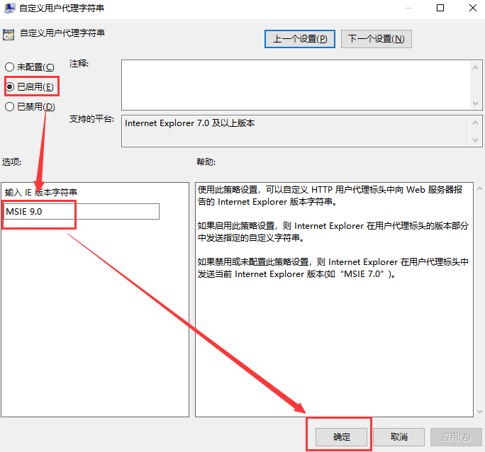 3.双击打开自定义用户代理字符串,设置为已启用,并输入MSIE 9.0,确定即可。