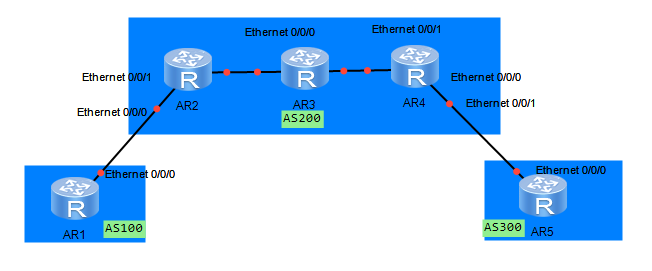 在一个AS内,BGP的邻居可以跨越路由器来建立,这样有可能造成路由黑洞,如图,R1与R2、R4与R5分别建立eBGP邻居,在AS200中,R2与R4建立iBGP邻居,R3没有配置BGP。假设R1通告一条路由199.100..20.0/24到BGP,并且传递给R2,R2通过iBGP邻居通告给R4,在同步未开启的情况下,R4 可以将该路由通告给eBGP邻居R5。此时R5要转发数据该数据流到该网段,数据包发送给R4,R4在BGP学习该路由,查找到达该网段下一跳为R2,但是R2并非直连,需要再次查找iBGP路由表,到达下一跳R3。数据包送到R3,但是R3没有运行BGP,并且在iBGP中没有学习该路由,数据包将会被R3丢弃,从而形成黑洞。
