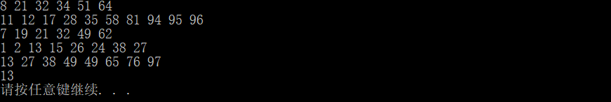 1 #include <iostream>、 2 using namespace std; 3 4 //插入排序 5 void insert_sort(int data[],int n) 6 { 7 int i, j,tmp; 8 for (int i = 1; i < n; i++)//进行n-1趟 9 { 10 tmp = data[i]; 11 for (j = i; j > 0; j--) 12 { 13 if (data[j - 1] > tmp) 14 data[j] = data[j - 1]; 15 else 16 break; 17 } 18 data[j] = tmp; 19 } 20 } 21 //希尔排序 22 void shell_sort(int data[], int n) 23 { 24 int i, j, increment=n/2,tmp; 25 for(increment=n/2;increment>0;increment/=2) 26 for (i = increment; i < n; i+=increment) 27 { 28 tmp = data[i]; 29 for (j = i; j > 0; j -= increment) 30 { 31 if (data[j - increment] > tmp) 32 data[j] = data[j - increment]; 33 else 34 break; 35 } 36 data[j] = tmp; 37 } 38 } 39 //堆排序 40 typedef struct heap_record 41 { 42 int capacity; 43 int size; 44 int *array; 45 }*Heap; 46 Heap initialize(int cap) 47 { 48 Heap H=(Heap)malloc(sizeof(heap_record)); 49 if (!H) return NULL; 50 H->capacity = cap; 51 H->size = 0; 52 H->array = (int*)malloc(sizeof(int)*(cap+1)); 53 H->array[0] = -1;//array[0]不用,作为标记 54 return H; 55 } 56 bool isempty(Heap H) 57 { 58 return H->size == 0; 59 } 60 bool isfull(Heap H) 61 { 62 return H->size == H->capacity; 63 } 64 void insert(Heap H,int x) 65 { 66 int i; 67 if (isfull(H)) 68 return; 69 for (i=++H->size; i != 0&&H->array[i / 2] > x;i/=2) 70 H->array[i] = H->array[i / 2]; 71 H->array[i] = x; 72 } 73 int delete_min(Heap H) 74 { 75 if (isempty(H)) 76 cout<<"堆为空"<<endl; 77 int i, child,tmp=H->array[H->size],delete_num=H->array[1]; 78 --H->size; 79 for (i = 1; 2*i <= H->size; i =child) 80 { 81 child = 2*i; 82 if (child<H->size&&H->array[child+1] < H->array[child ]) 83 child++; 84 if(tmp>H->array[child]) 85 H->array[i] = H->array[child]; 86 else 87 break; 88 } 89 H->array[i] = tmp; 90 return delete_num; 91 } 92 Heap heap_sort(int data[], int n) 93 { 94 Heap H; 95 int delete_num; 96 H = initialize(n); 97 for (int i = 0; i < n; i++) 98 insert(H, data[i]);//创建堆 99 for (int i = 0; i < n; i++) 100 { 101 delete_num = delete_min(H); 102 H->array[n - i] = delete_num; 103 } 104 return H; 105 } 106 //归并排序 107 void merge(int A[],int Tmp[],int lpos,int rpos,int rend)//归并操作 108 {//lpos是左边部分的第一个位置,rpos是右边部分的第一个位置,rend是右边的最后的位置 109 int tmpos, lend; 110 tmpos = lpos; lend = rpos - 1; 111 int num = rend - lpos + 1; 112 while (lpos <= lend && rpos <= rend) 113 { 114 if (A[lpos] < A[rpos]) 115 { 116 Tmp[tmpos] = A[lpos]; 117 tmpos++; lpos++; 118 } 119 else 120 { 121 Tmp[tmpos] = A[rpos]; 122 tmpos++; rpos++; 123 } 124 } 125 while (lpos <= lend) 126 { 127 Tmp[tmpos] = A[lpos]; 128 lpos++; tmpos++; 129 } 130 while (rpos <= rend) 131 { 132 Tmp[tmpos] = A[rpos]; 133 rpos++; tmpos++; 134 } 135 for (int i = 0; i < num; i++)//将排好序的数组拷贝回原来的A数组 136 A[i] = Tmp[i]; 137 } 138 void divide(int A[],int Tmp[],int left,int right) 139 {//将数组分成小块排序,用递归实现 140 int center; 141 if (left < right) 142 { 143 center = (left + right) / 2; 144 divide(A, Tmp, left, center); 145 divide(A, Tmp, center + 1, right); 146 merge(A, Tmp, left, center + 1, right); 147 } 148 } 149 void merge_sort(int A[], int n) 150 { 151 int *Tmp; 152 Tmp = (int*)malloc(sizeof(int)*n); 153 divide(A, Tmp, 0, n - 1); 154 free(Tmp); 155 } 156 //快速排序 157 int partition(int A[],int low,int high) 158 {//将大于pivot的元素置于其右边,小于pivot的元素置于其左边 159 int pivotkey; 160 pivotkey = A[low];//用第一个元素做枢纽元 161 while (low < high) 162 { 163 while (low < high&&A[high] >= pivotkey) { high--; } 164 A[low] = A[high]; 165 while (low < high&&A[low] <= pivotkey) { low++; } 166 A[high] = A[low]; 167 } 168 A[low] = pivotkey; 169 return low;//返回pivot位置 170 } 171 void quick_sort(int A[], int low, int high) 172 { 173 int pivot; 174 if (low < high)//当元素个数大于1时 175 { 176 pivot = partition(A, low, high); 177 quick_sort(A, low, pivot - 1); 178 quick_sort(A, pivot + 1, high); 179 } 180 } 181 //用快速排序解决快速选择问题 182 int quick_select(int A[], int k, int low, int high) 183 {//找出一组数据中第k个最小元 184 int pivot; 185 pivot = partition(A, low, high); 186 if (k - 1 == pivot)//如果枢纽元处的元素恰好是第k个元素,则返回该元素 187 return A[k - 1]; 188 if (k - 1 < pivot)//如果第k个位置在枢纽元前面,则在前面的数据中找 189 return quick_select(A, k, low, pivot - 1); 190 if (k - 1 > pivot)//如果第k个位置在枢纽元后面,则在后面的数据中找 191 return quick_select(A, k, pivot + 1, high); 192 } 193 int main() 194 { 195 //插入排序 196 int data0[] = { 34,8,64,51,32,21 }; 197 insert_sort(data0, 6); 198 for (int i = 0; i < 6; i++) 199 cout << data0[i] << " "; 200 cout << endl; 201 //希尔排序 202 int data1[] = { 81,94,11,96,12,35,17,95,28,58 }; 203 shell_sort(data1, 10); 204 for (int i = 0; i < 10; i++) 205 cout << data1[i] << " "; 206 cout << endl; 207 //堆排序 208 int data2[] = { 32,7,62,49,21,19 }; 209 Heap H=heap_sort(data2, 6); 210 for (int i = 6; i > 0; i--) 211 cout << H->array[i] << " "; 212 cout << endl; 213 //归并排序 214 int data3[] = { 13,1,26,24,2,15,38,27 }; 215 merge_sort(data3, 8); 216 for (int i = 0; i <8; i++) 217 cout << data3[i] << " "; 218 cout << endl; 219 //快速排序 220 int data4[] = { 49,38,65,97,76,13,27,49 }; 221 quick_sort(data4, 0, 7); 222 for (int i = 0; i < 8; i++) 223 cout << data4[i] << " "; 224 cout << endl; 225 int a=quick_select(data4, 1, 0, 7); 226 cout << a << endl; 227 system("pause"); 228 return 0; 229 }