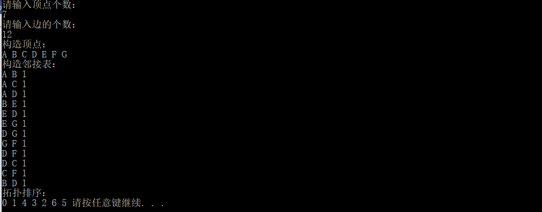 1 #include <iostream> 2 using namespace std; 3 #define MAX_VERTEX_NUM 10//最大顶点个数 4 5 //创建队列 6 struct Queue 7 { 8 int rear; 9 int front; 10 int size; 11 int cap; 12 int *array; 13 }; 14 Queue* CreateQueue() 15 { 16 Queue *Q = (Queue*)malloc(sizeof(Queue)); 17 Q->rear = -1; Q->front = 0; 18 Q->size = 0; Q->cap = MAX_VERTEX_NUM ; 19 Q->array = (int*)malloc(sizeof(int)*MAX_VERTEX_NUM); 20 return Q; 21 } 22 bool isempty(Queue* Q)//队列是否为空 23 { 24 return Q->size==0; 25 } 26 bool isfull(Queue* Q) 27 { 28 return Q->size == Q->cap; 29 } 30 void Enqueue(Queue *Q,int v)//入队 31 { 32 if (isfull(Q)) 33 return; 34 Q->rear++; Q->size++; 35 Q->array[Q->rear] = v; 36 } 37 int Dequeue(Queue* Q)//出队 38 { 39 if (isempty(Q)) 40 return 0; 41 int a = Q->array[Q->front]; 42 Q->front++; Q->size--; 43 return a; 44 } 45 46 //创建图(邻接表) 47 struct ENode//边结点 48 { 49 int index;//边所指向的点的序号 50 int info;//记录权值 51 struct ENode* next;//指向下一条边 52 }; 53 struct VNode//顶点结点 54 { 55 char data;//顶点名称 56 ENode* first;//指向顶点的第一个邻边 57 }; 58 struct AGraph//记录图的信息 59 { 60 int vexnum, arcnum;//顶点数和边数 61 VNode p[MAX_VERTEX_NUM];//顶点数组 62 }; 63 64 int LocateVex(AGraph *G, char ch) 65 { 66 for (int i = 0; i < G->vexnum; i++) 67 if (ch == G->p[i].data) 68 { 69 return i; 70 break; 71 } 72 return -1; 73 } 74 //创建邻接表 75 void CreateAGraph(AGraph *G) 76 { 77 int i, j, info; 78 char v1, v2; 79 cout << "请输入顶点个数:" << endl; cin >> G->vexnum; 80 cout << "请输入边的个数:" << endl; cin >> G->arcnum; 81 cout << "构造顶点:" << endl; 82 for (int i = 0; i < G->vexnum; i++)//构造顶点数组 83 { 84 cin >> G->p[i].data; 85 G->p[i].first = NULL; 86 } 87 cout << "构造邻接表:" << endl; 88 for (int k = 0; k < G->arcnum; k++) 89 { 90 cin >> v1 >> v2 >> info; 91 i = LocateVex(G, v1); 92 j = LocateVex(G, v2); 93 ENode *E = (ENode*)malloc(sizeof(ENode)); 94 E->index = j; 95 E->info = info; 96 E->next = G->p[i].first;//头插法 97 G->p[i].first = E; 98 } 99 } 100 //求每个顶点的入度 101 int Indegree[MAX_VERTEX_NUM] = { 0 };//记录入度 102 void VexIndegree(AGraph *G) 103 { 104 for (int i = 0; i < G->vexnum; i++) 105 { 106 if (G->p[i].first != NULL) 107 { 108 ENode* e = G->p[i].first; 109 while (e != NULL) 110 { 111 Indegree[e->index]++; 112 e = e->next; 113 } 114 } 115 } 116 } 117 118 //拓扑排序 119 void Topsort(AGraph *G) 120 { 121 Queue *Q = CreateQueue(); 122 VexIndegree(G); 123 for (int i = 0; i < G->vexnum; i++)//先将入度为0的点全部入队 124 { 125 if (Indegree[i] == 0) 126 Enqueue(Q, LocateVex(G,G->p[i].data)); 127 } 128 while (!isempty(Q))//当队列不空 129 { 130 131 int v=Dequeue(Q);//出队 132 if (G->p[v].first != NULL)//若v的存在邻接点 133 { 134 ENode* e = G->p[v].first; 135 while (e != NULL) 136 { 137 if (--Indegree[e->index] == 0)//将v的邻接点的入度皆减1,若为0,则入队 138 Enqueue(Q, e->index); 139 e = e->next; 140 } 141 } 142 } 143 cout << "拓扑排序:" << endl; 144 for (int i = 0; i < G->vexnum; i++) 145 cout << Q->array[i] << " "; 146 } 147 int main() 148 { 149 AGraph* G = (AGraph*)malloc(sizeof(AGraph)); 150 CreateAGraph(G); 151 Topsort(G); 152 system("pause"); 153 return 0; 154 }