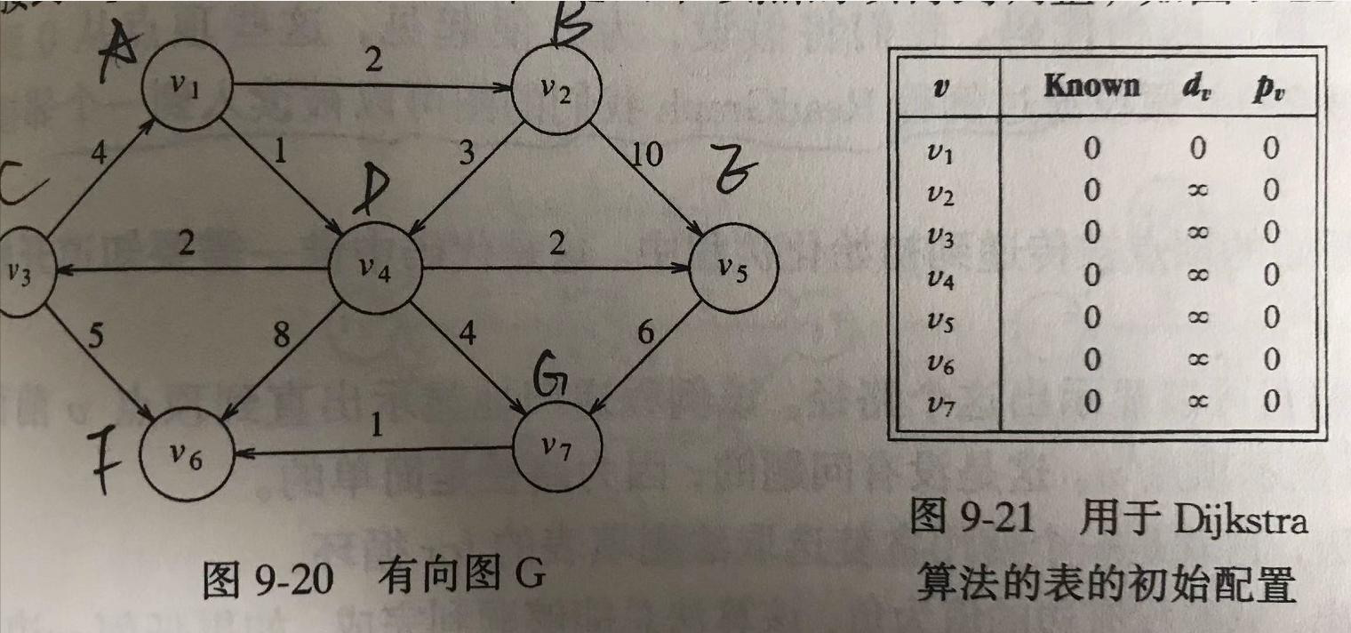 假设开始结点为v1,则v1先标记为已知(known=1),路径长为0,v1已知后,需要对某些表项进行调整,邻接v1的是v2和v4,调整其距离dv和路径pv。先选取v4(因为路径更短)并标记为已知,v4邻接顶点是v3、v5、v6、v7,对其距离和路径进行调整。接着选择v2,标记为已知,v4是邻接点但已经是已知的了,v5是邻接点但无需调整,因为经过v2的值为2+10=12>3。下一个被选取的顶点是v3,对v6的距离调整到3+5=8。下一个是v5,v7是唯一顶点但无需调整,因为3+6>5。再下一个顶点选取v7,v6下调到5+1=6。最后选取v6标记为已知,其无邻接顶点。所有的顶点都标记为已知,算法结束。其中上表的dv项记录从开始顶点到该顶点的最短距离,pv项仅记录经过该顶点的上一个顶点。